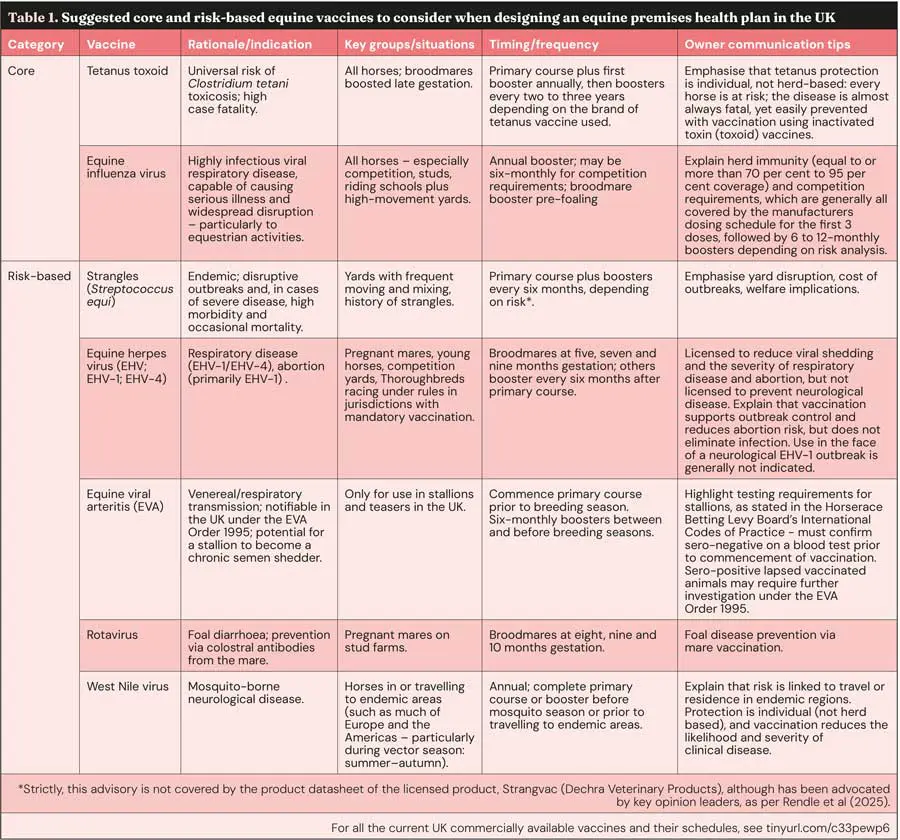 Effective equine health management relies on prevention, with vaccination and parasite control embedded within broader premises-wide plans. Core vaccines such as tetanus and influenza remain essential for all horses, while risk-based options should be tailored to specific populations.
