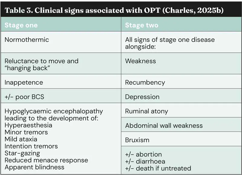 Clinical signs associated with OPT are shown in Table 3; these can be grouped into two stages, with progression from stage 1 to stage 2 often occurring over several days.