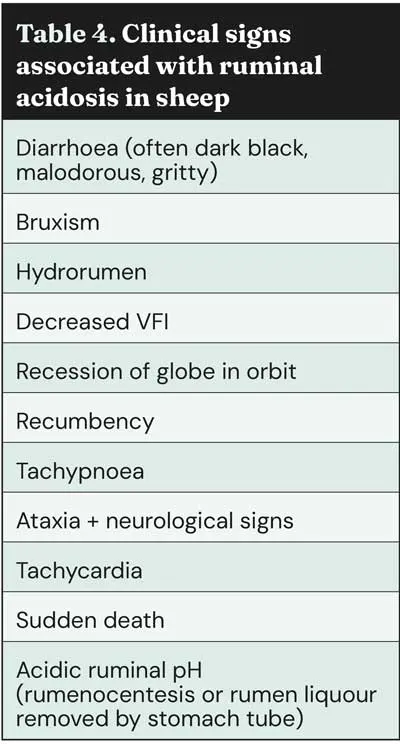 Clinical signs are shown in Table 4; however, this is often a diagnosis reached during postmortem examination – pH testing of ruminal content can be performed (often below pH 5.5 – acute cases can see pH <4.0) and a characteristic malodour is often present.