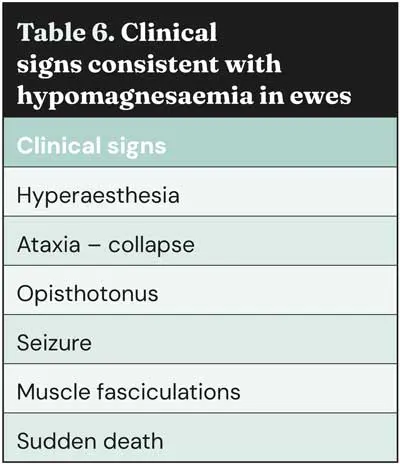 Often, ewes are found dead or as “sudden death” cases, and signs from the environment such as evidence of paddling or seizure in the grass/ground (Figure 2) can be suggestive of seizure or opisthotonus before death. If ewes are found alive then clinical signs (Table 6) can aid diagnosis, alongside blood test (magnesium concentration less than 0.6mmol/L).