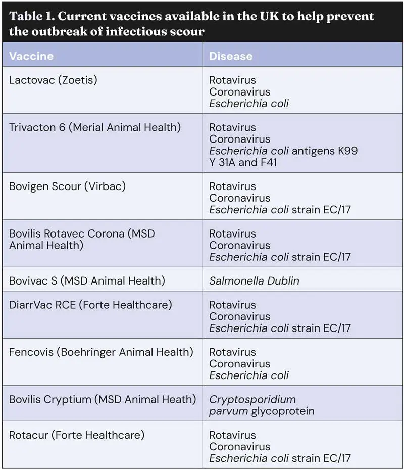 A summary of current available vaccines in the UK for calf scour is shown in Table 1. Products are also licensed for the prevention and treatment of infectious protozoal causes, which include halofuginone for Cryptosporidium and anti-coccidiostats for coccidiosis. Both types of treatments can be used prophylactically, although a diagnosis of the diseases should be confirmed beforehand – especially as halofuginone is toxic at twice the therapeutic dose rate (NOAH, 2025).