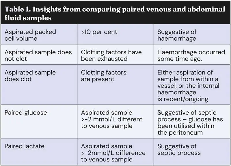 Comparing paired venous and abdominal fluid samples for lactate, glucose and PCV can help characterise the type of effusion, and give insight into cause (Table 1).