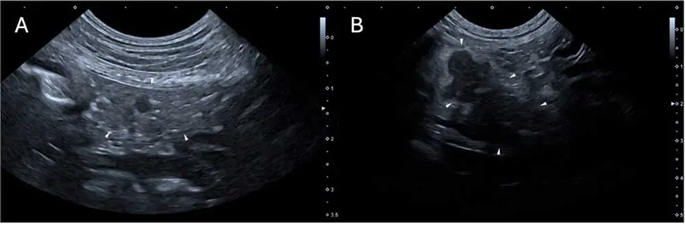 The bottom line is that AUS does not allow for the 100% confirmation or exclusion of CAP. Studies have suggested sensitivity of 70% to 88% for ultrasonographic changes, sometimes dependent on the criteria used21,40,42,43,49. Suggested criteria are identification of at least two highly suggestive changes: pancreatomegaly, pancreatic hypoechogenicity, pancreatic heterogenous echogenicity, hyperechoic mesentery (potentially the most commonly reported at 82% to 83%) and peripancreatic free fluid16,20,36,49,50. Potentially suggestive, but less important, signs are corrugated adjacent duodenum/colon, pancreatic cysts/abscesses, venous thrombosis, biliary/pancreatic duct dilation, thickening of the gastric/duodenal wall and signs of ileus36. Strong evidence exists that AUS findings change over time and may lag behind disease progression, as cPLI activity appears to increase first36,39. In two studies, at time of admission 12 out of 38 (32%) and 24 out of 37 (65%) dogs had at least two highly suggestive signs of CAP, but a further 12 out of 38 and 10 out of 37 (who mostly had no changes at all on admission) developed these after two to three days, for a total sensitivity of 68% to 92%36,39. Therefore, for dogs where CAP diagnosis is not clear but still suspected, repeating AUS after two to three days may be of significant aid (Figure 2).