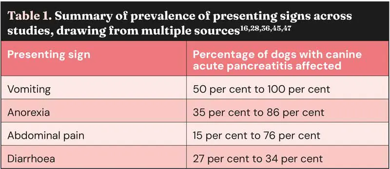 The average age of dogs with CAP has been reported broadly as 8 to 11 years old, reflecting that it is adult dogs, perhaps slightly older, which are most commonly affected5,20,26,34-38,41,44-46. Unsurprisingly, vomiting appears to be the most common clinical sign, generally (Table 1)28,47.