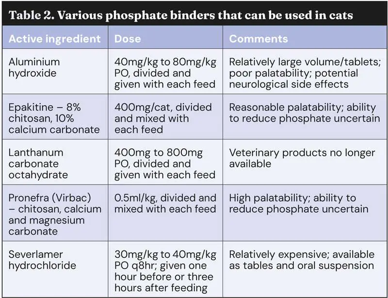 If dietary management does not lead to phosphate control, phosphate binders should be considered (Table 2). A variety of options are available but can be challenging to use due to tablet size, frequency of dosing and palatability.