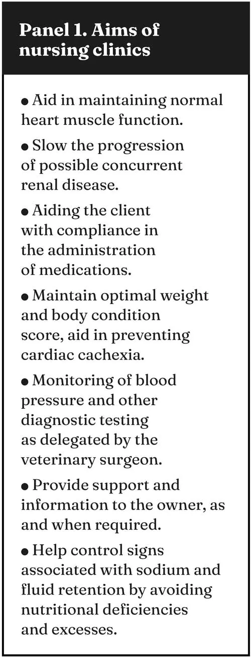 As part of the RVN clinic, the underpinning knowledge for cardiac disease is required. Panel 1 describes the aims of a nursing clinic involving an animal with cardiac disease. This includes the day one competencies of blood pressure measurement and running of an ECG trace.