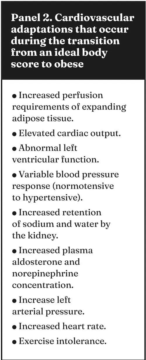 The progression of cardiac disease can be exacerbated in obese animals. This can result in cardiomegaly, circulatory congestion, oedema, ascites and hypocalcaemia. An overweight animal must be subjectively assessed; obesity must be differentiated from abdominal distension due to hepatomegaly or ascites. Obesity can also mask an underlying lean muscle body mass. Obesity not only produces clinical signs (Panel 2) that mimic those of early heart failure but can also cause cardiovascular changes that can exacerbate any underlying cardiovascular disease.