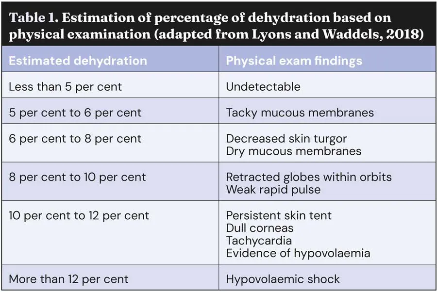 Percentage dehydration can be estimated by examining mucous membrane moisture, skin turgor, eye position and corneal moisture, as described in Table 1.