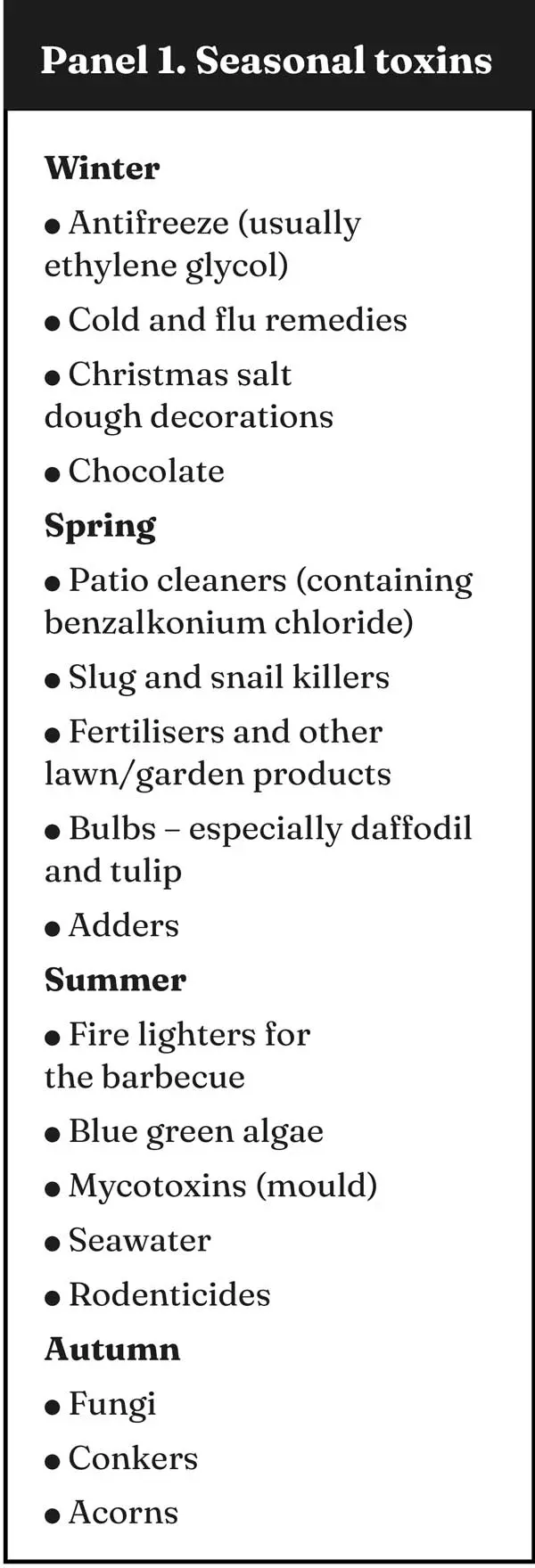 It is worth knowing which toxins you are likely to see at different times of the year so that they are top of your list if a patient comes in with specific signs but no witnessed ingestion. See Panel 1 for some common poisons by season.