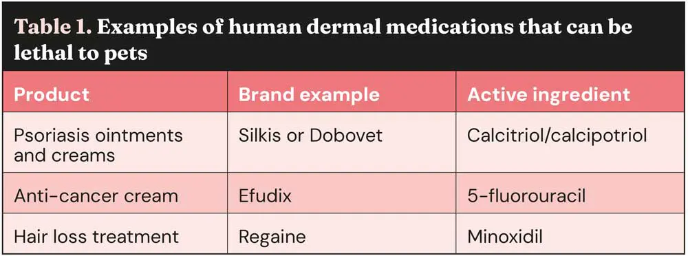 Quantity alone is not always an indicator to treat – it is the toxic dose that is important. There are some medications where a significant number of tablets can be ingested with little effect and no treatment is needed, while others are extremely toxic at very low doses. Some dermal medications are particularly toxic and can cause serious clinical signs or fatalities at very low doses; for examples, see Table 1.
