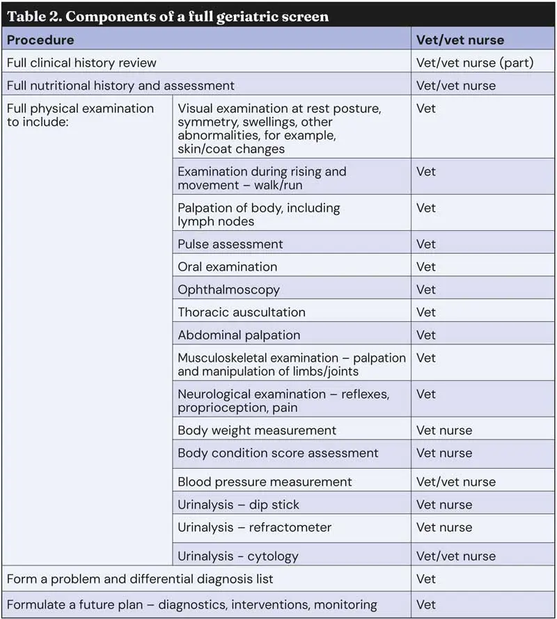 There is no point in doing a screen unless it rules in or out the presence of the main common age-related diseases (Table 1; Davies, 1996; Goldstone and Hoskins, 1995; Davies, 2012; Sturgess, 2024). Therefore, a geriatric screen must include a series of procedures (Table 2), some of which can be done by a trained veterinary nurse, but others can only be done by an experienced veterinary surgeon.