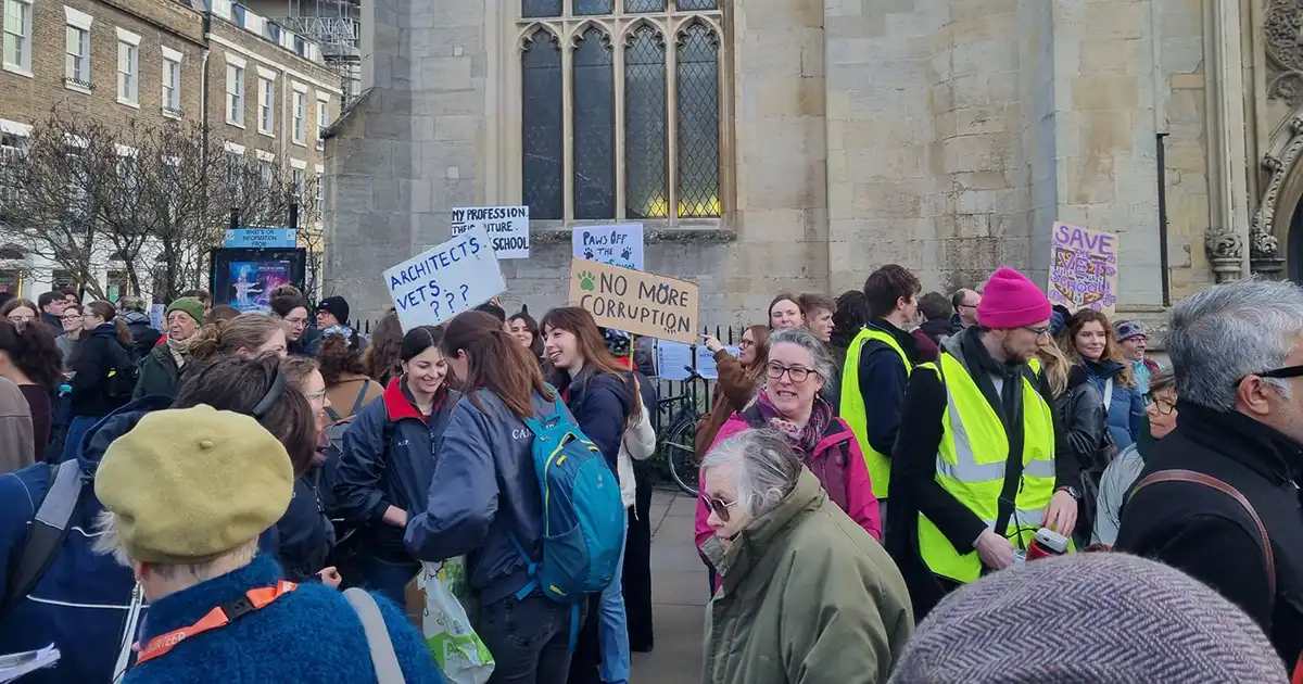 Protestors outside a crucial meeting on the future of the University of Cambridge vet school on 23 February 2026.